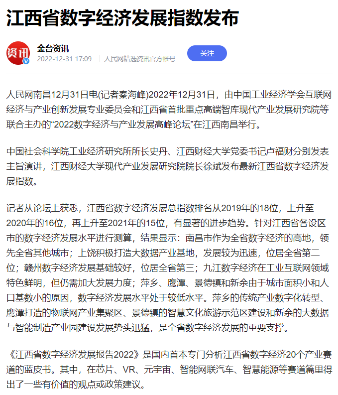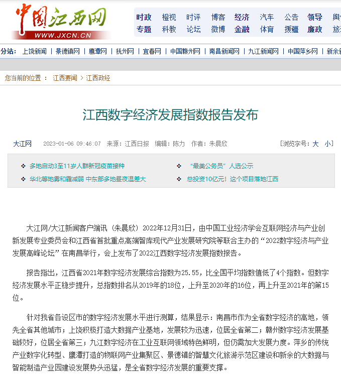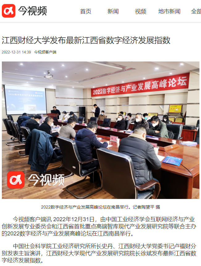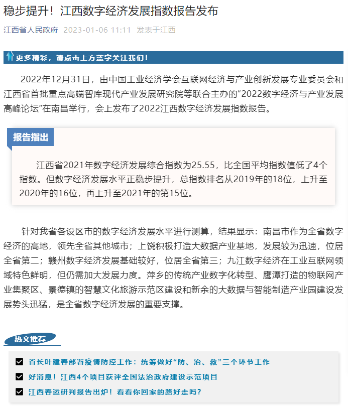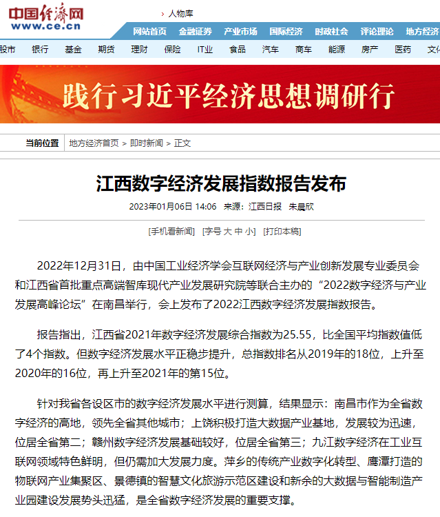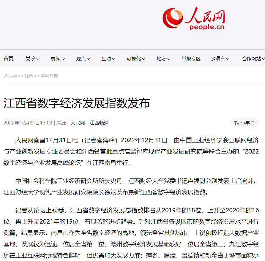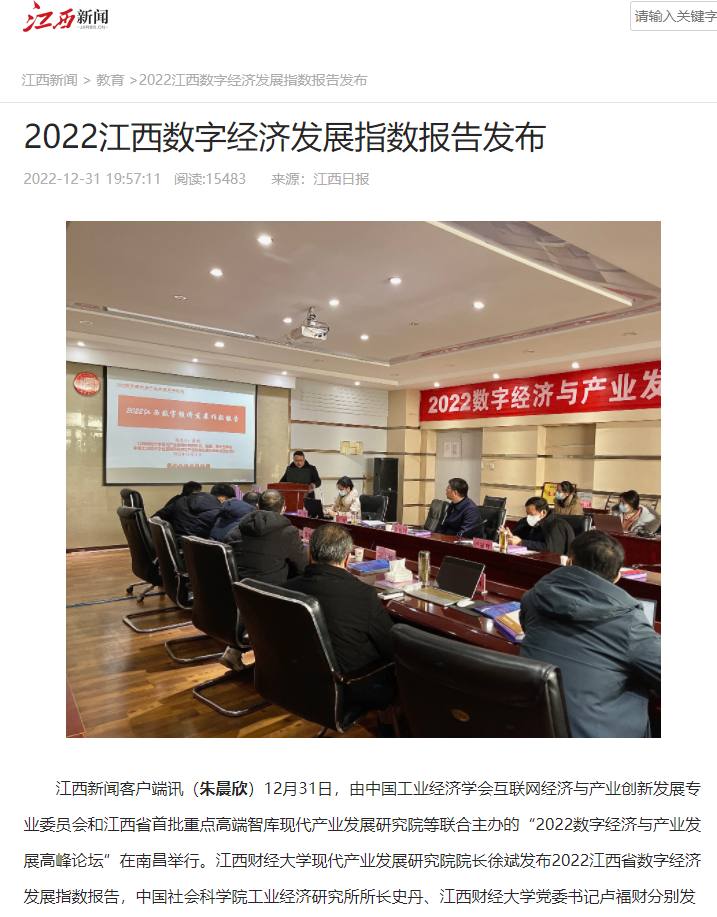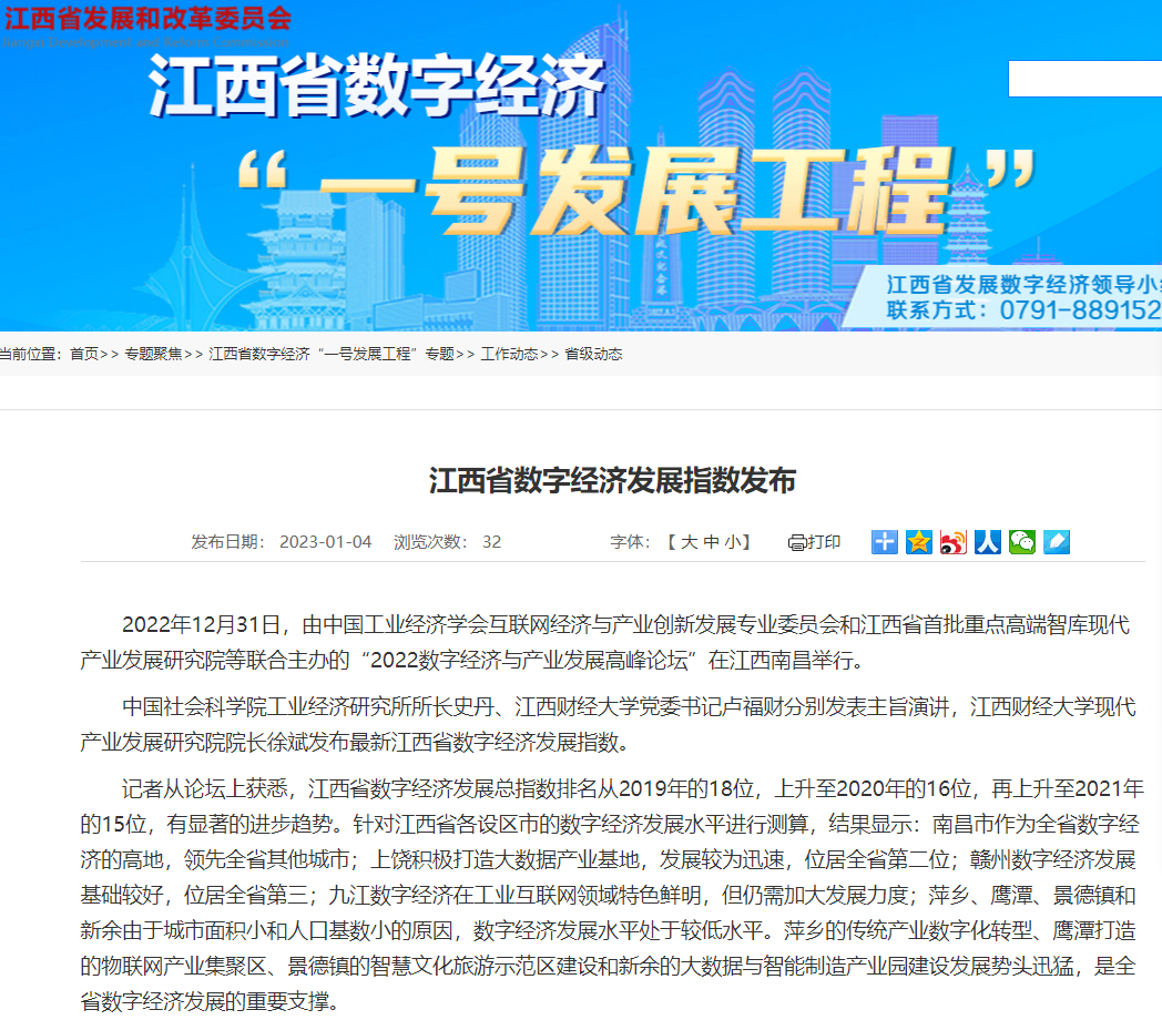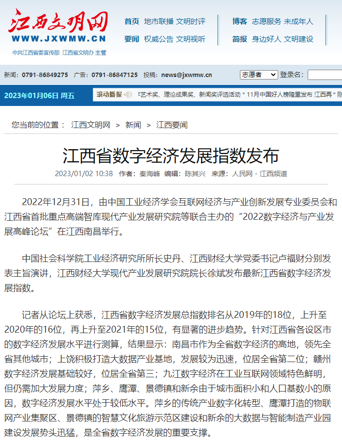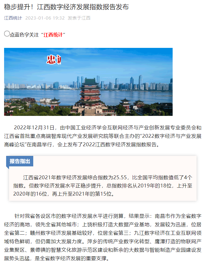 2022年12月31日,中国工业经济学会互联网经济与产业创新发展专业委员会秘书长、江西财经大学现代产业发展研究院院长徐斌教授发布2022江西数字经济发展指数,并指出,江西省数字经济发展水平正稳步提升,总指数排名从2019年的18位,上升至2020年的16位,再上升至2021年的第15位。截至1月6日,由中国工业经济学会互联网经济与产业创新发展专业委员会和江西财经大学现代产业发展研究院联合发布的2022江西数字经济发展指数被众多媒体争相转载。