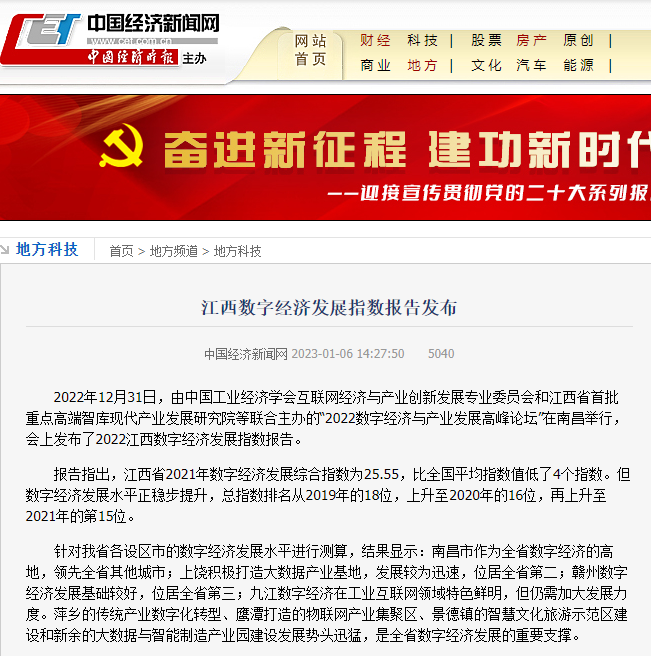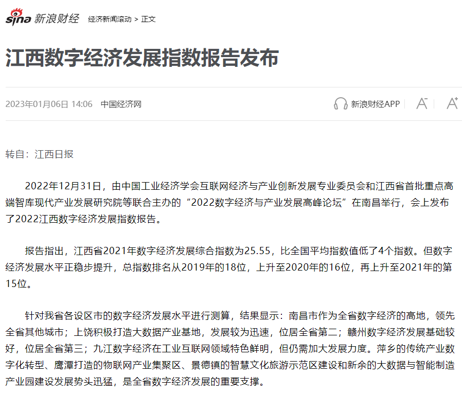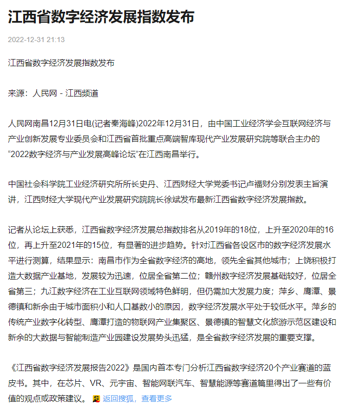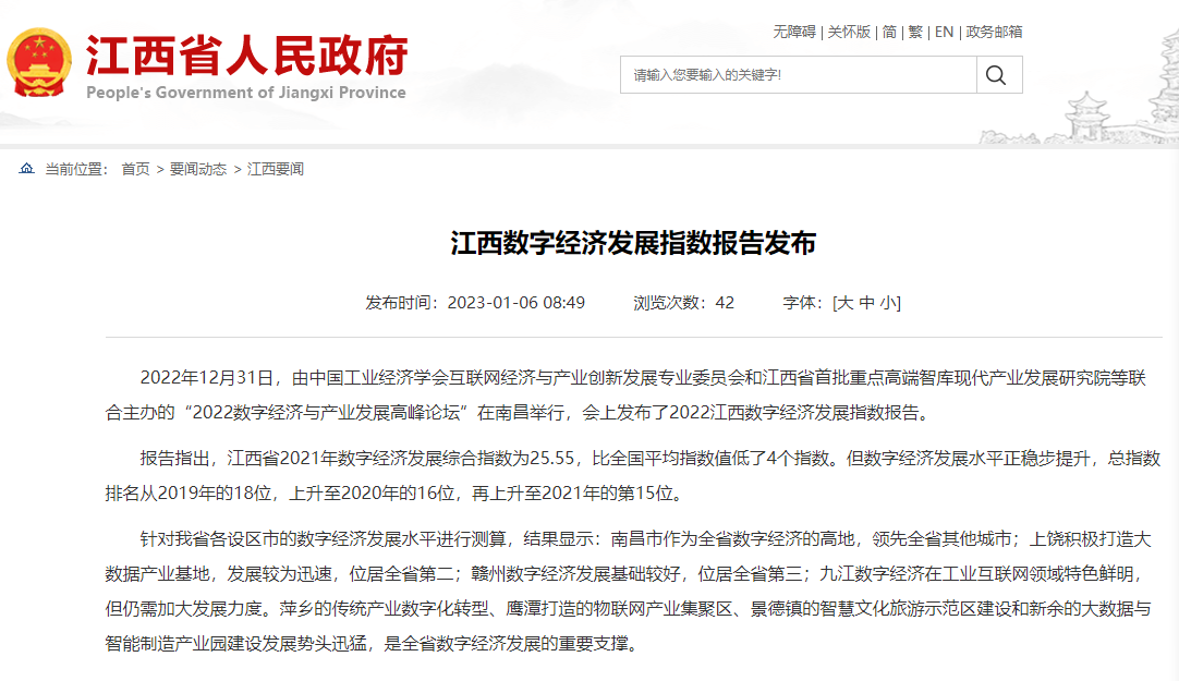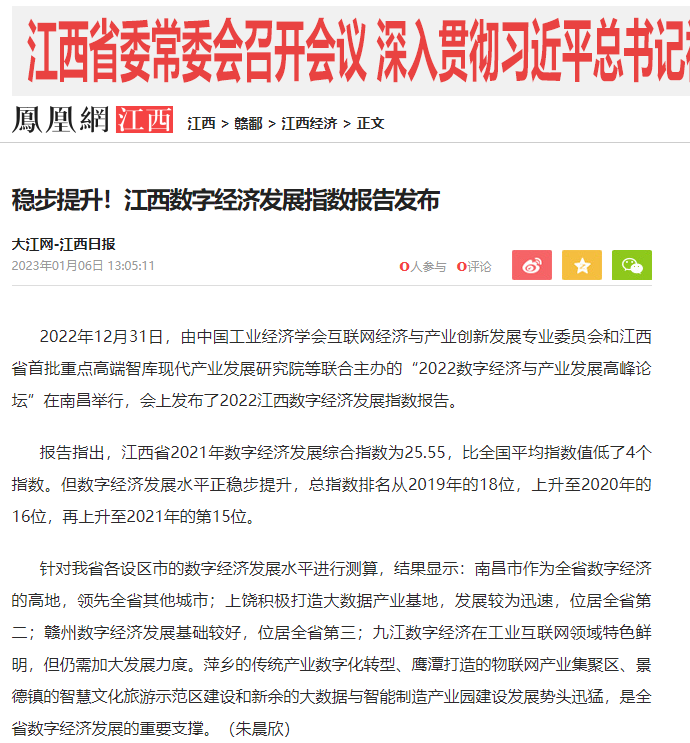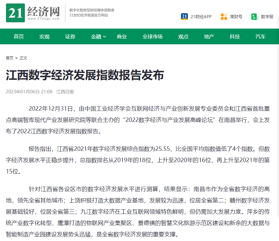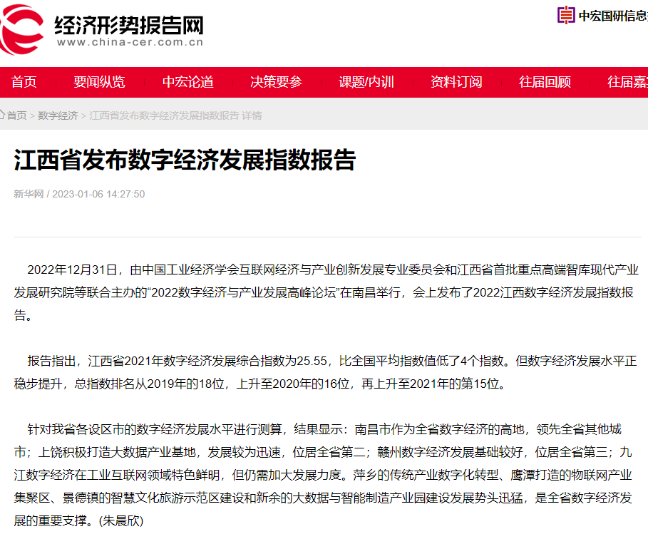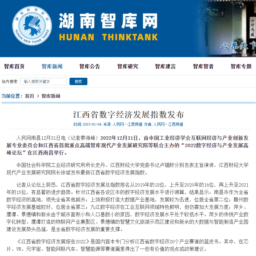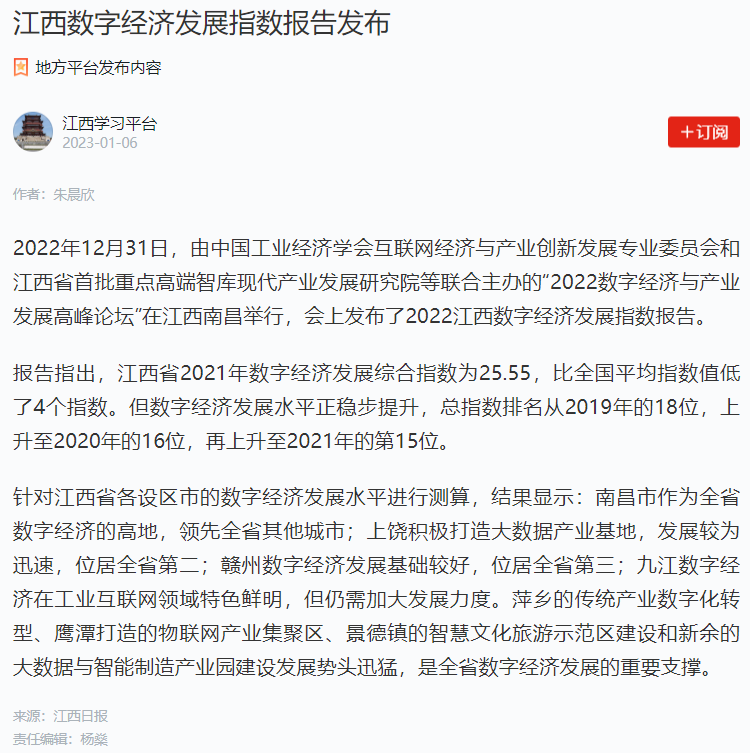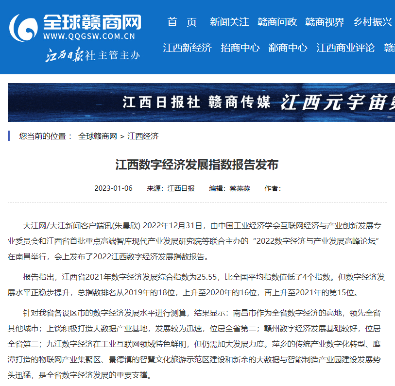 2022年12月31日,中国工业经济学会互联网经济与产业创新发展专业委员会秘书长、江西财经大学现代产业发展研究院院长徐斌教授发布2022江西数字经济发展指数,并指出,江西省数字经济发展水平正稳步提升,总指数排名从2019年的18位,上升至2020年的16位,再上升至2021年的第15位。截至1月6日,由中国工业经济学会互联网经济与产业创新发展专业委员会和江西财经大学现代产业发展研究院联合发布的2022江西数字经济发展指数被众多媒体争相转载。