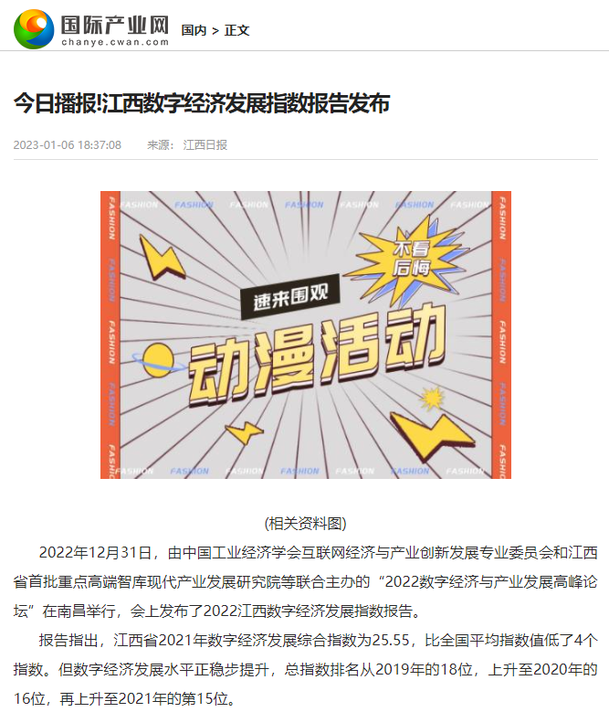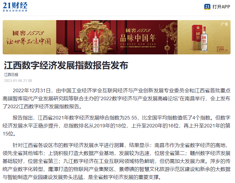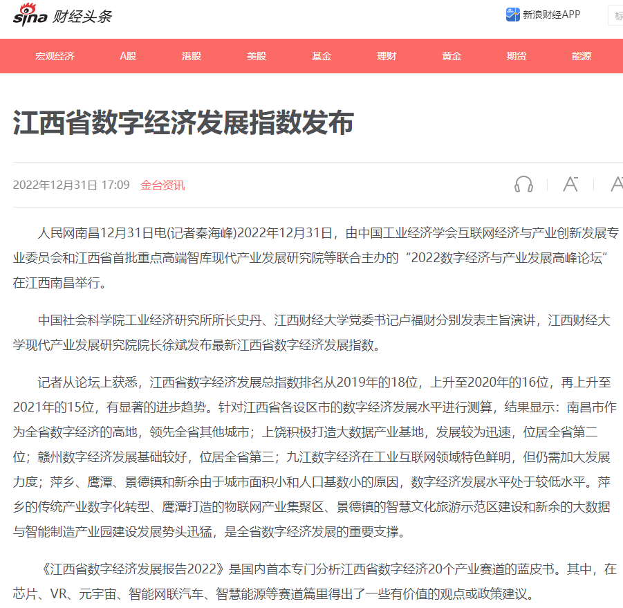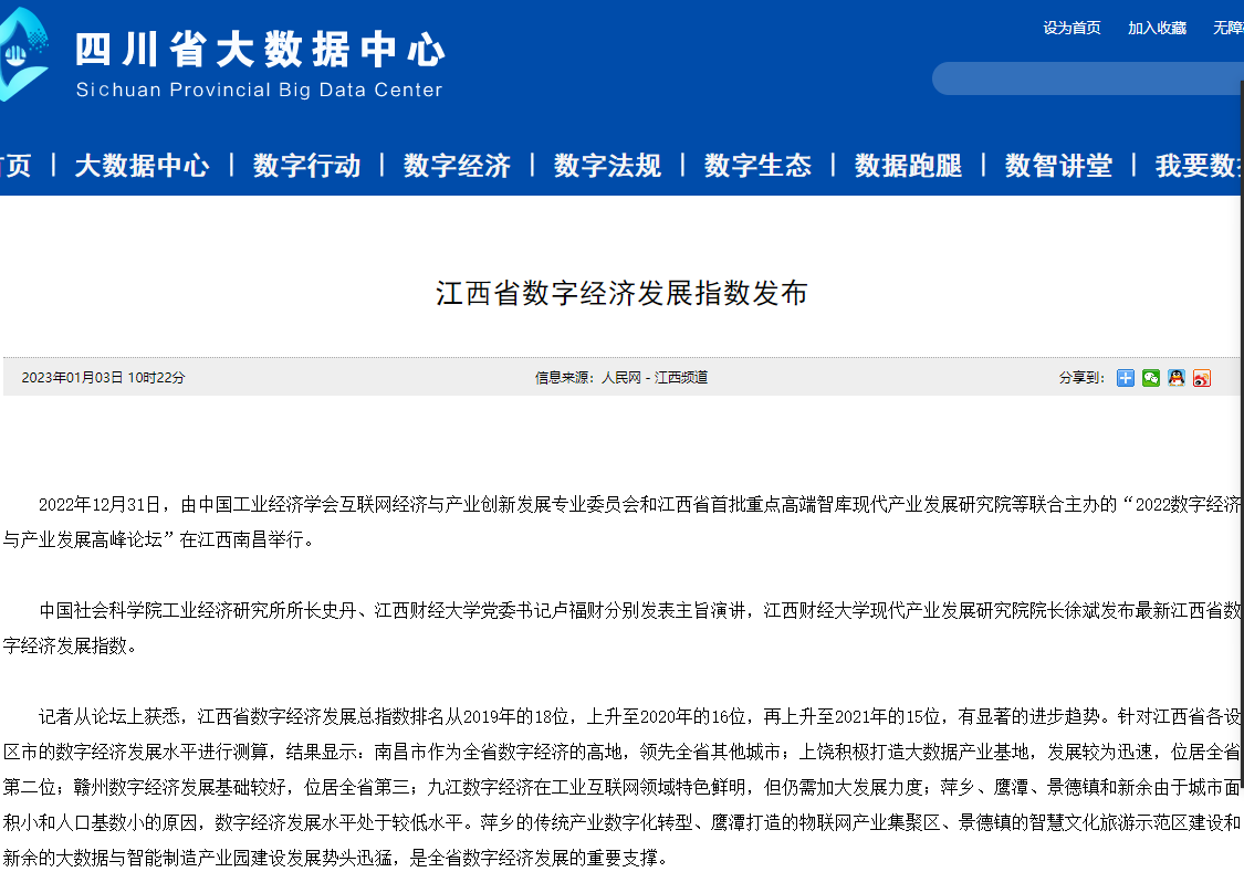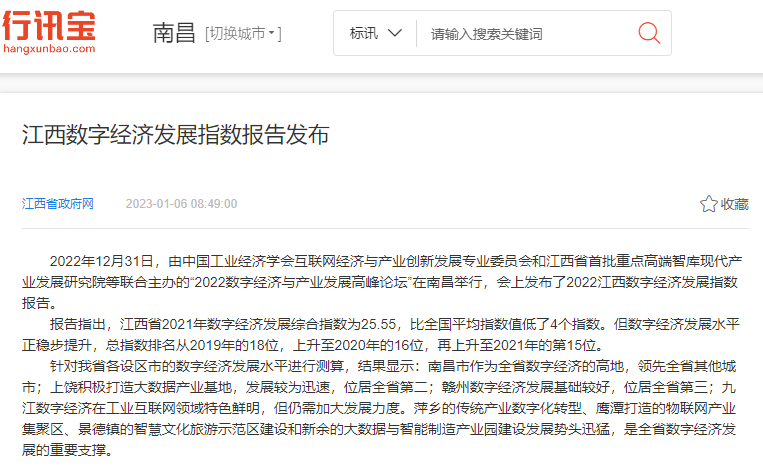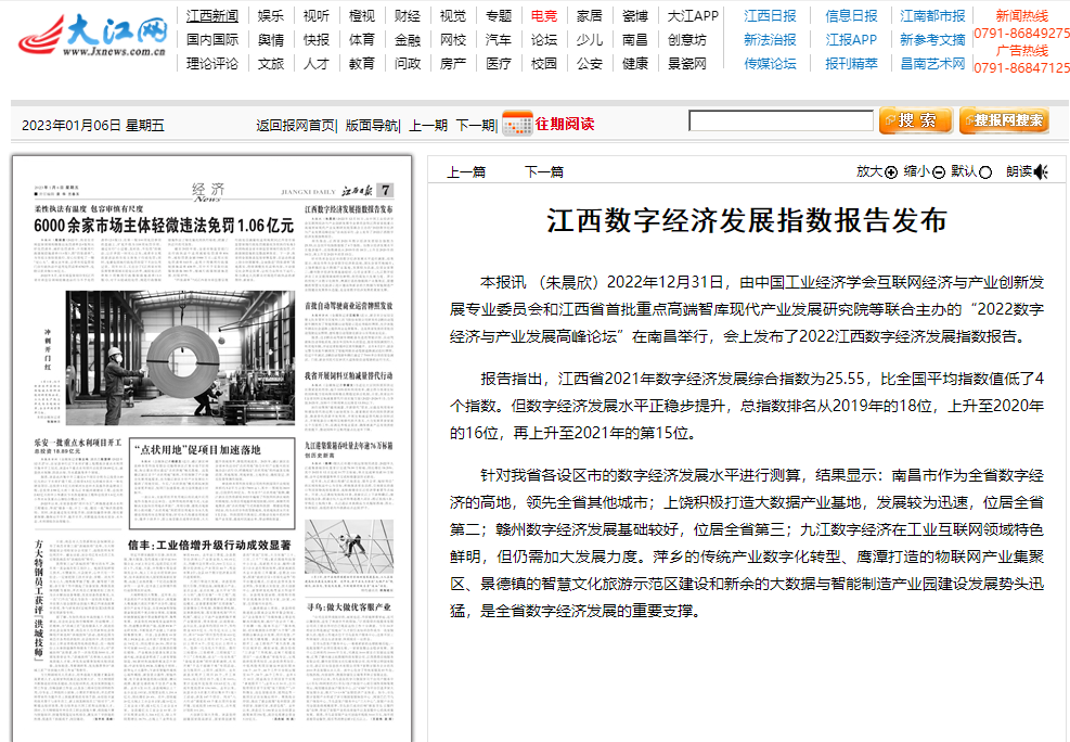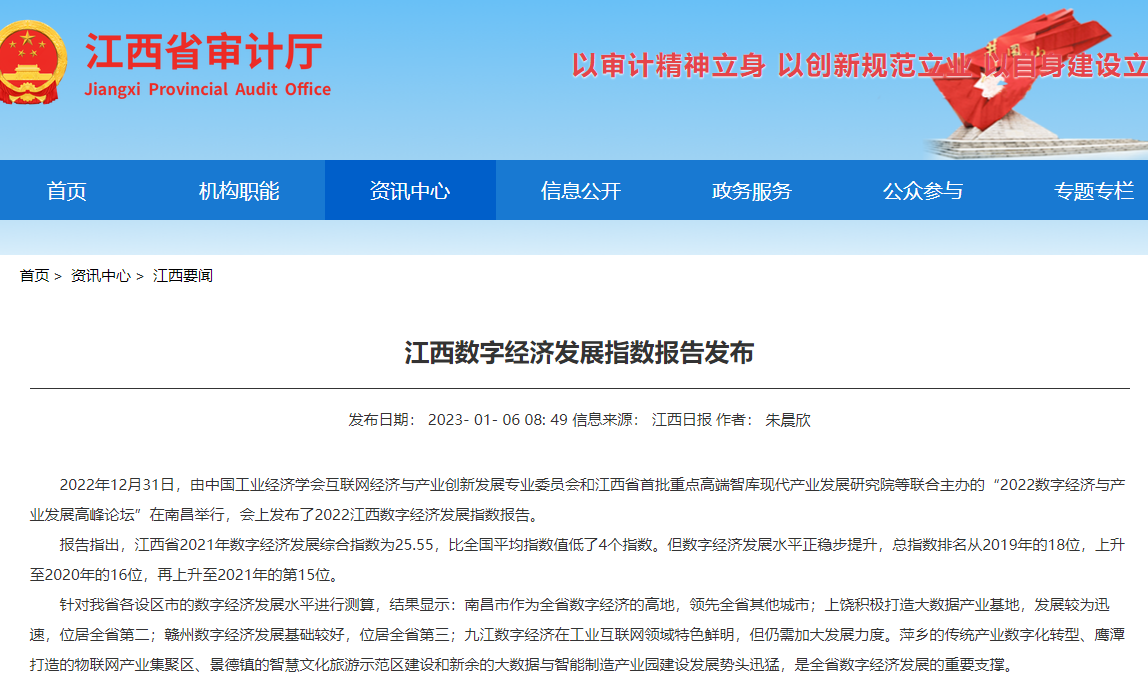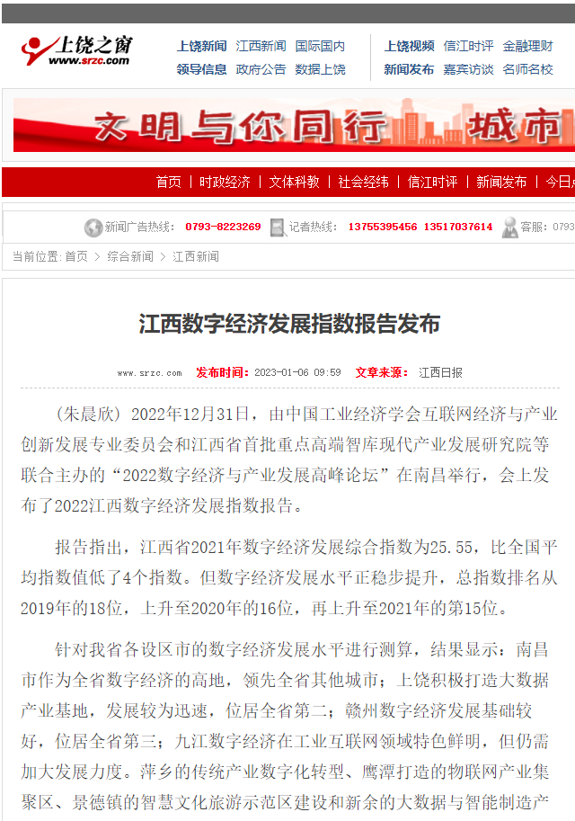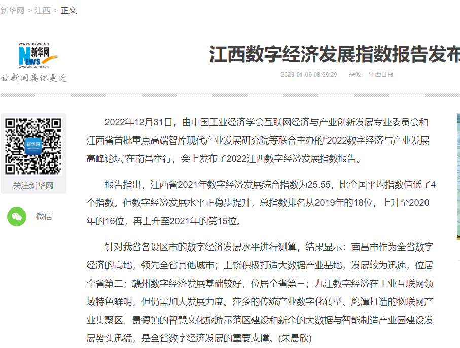 2022年12月31日,中国工业经济学会互联网经济与产业创新发展专业委员会秘书长、江西财经大学现代产业发展研究院院长徐斌教授发布2022江西数字经济发展指数,并指出,江西省数字经济发展水平正稳步提升,总指数排名从2019年的18位,上升至2020年的16位,再上升至2021年的第15位。截至1月6日,由中国工业经济学会互联网经济与产业创新发展专业委员会和江西财经大学现代产业发展研究院联合发布的2022江西数字经济发展指数被众多媒体争相转载。