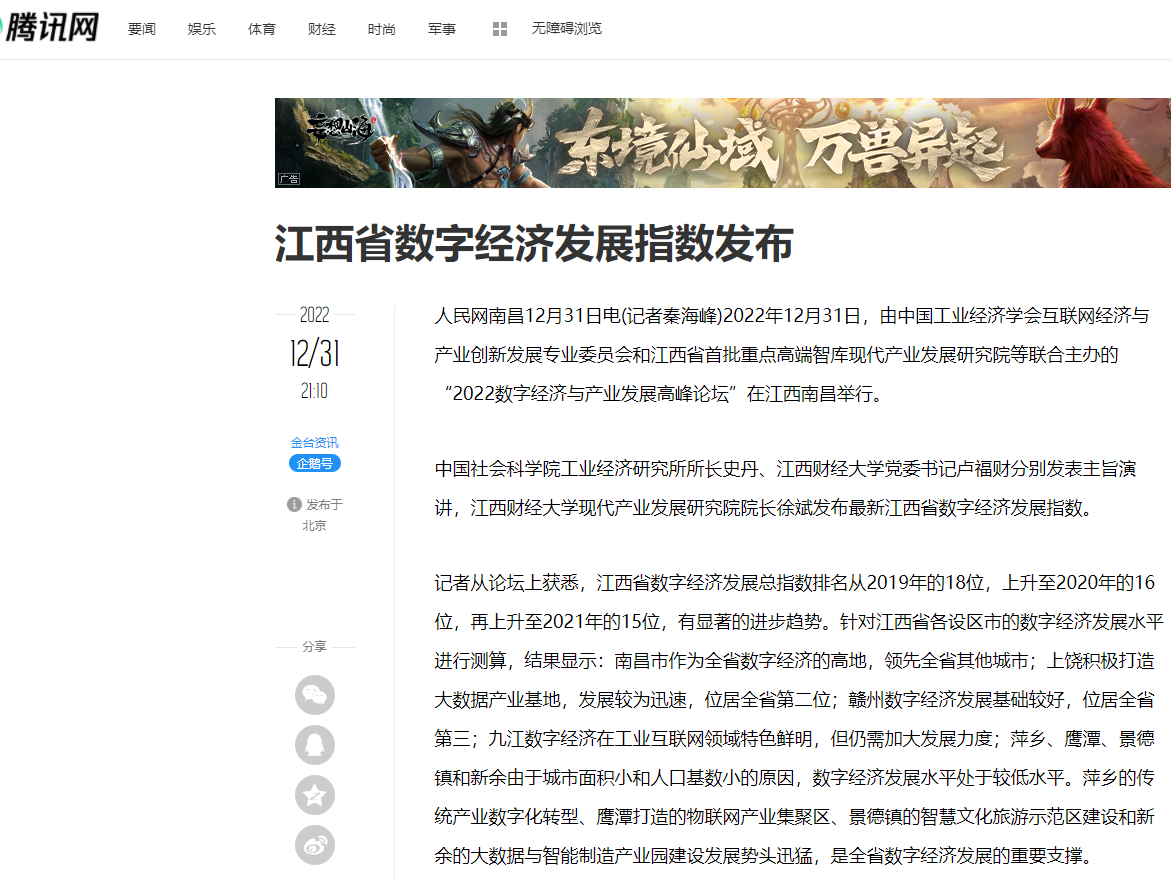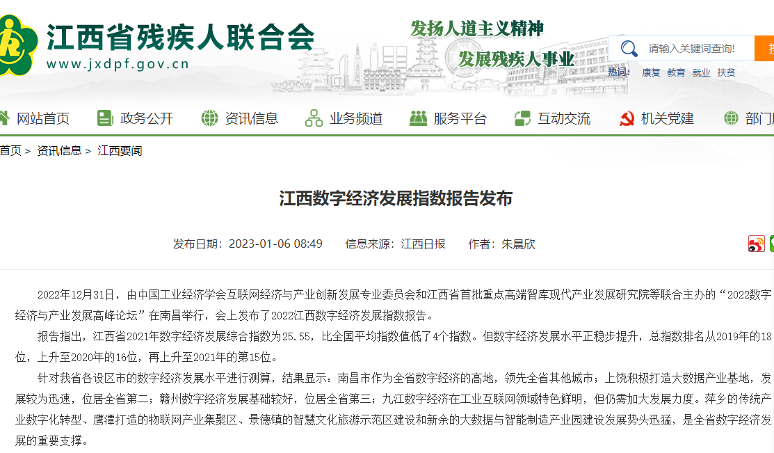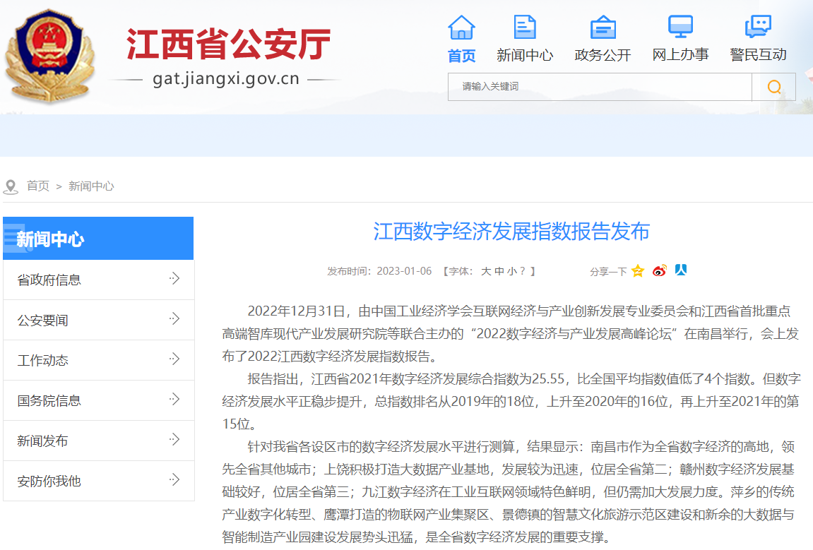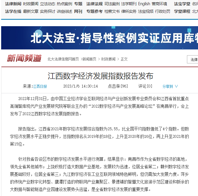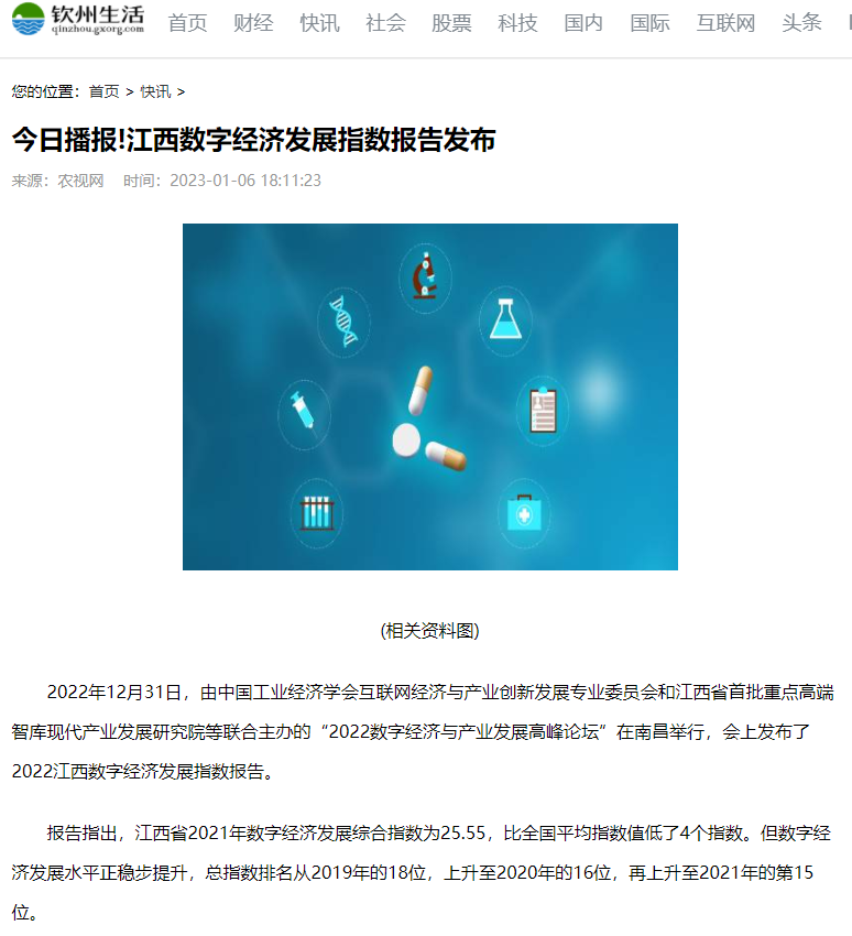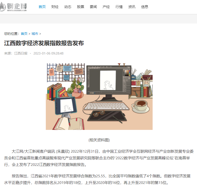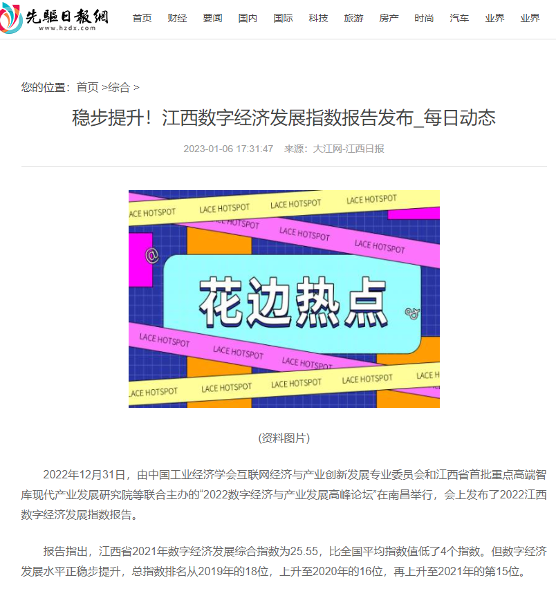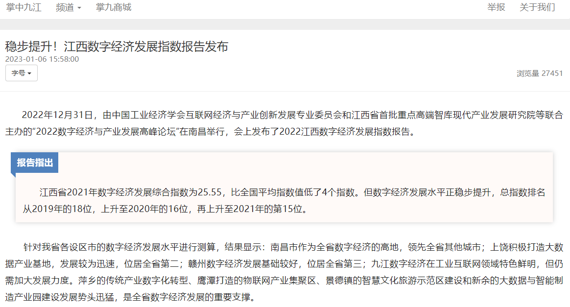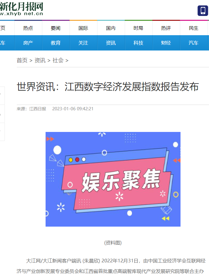 2022年12月31日,中国工业经济学会互联网经济与产业创新发展专业委员会秘书长、江西财经大学现代产业发展研究院院长徐斌教授发布2022江西数字经济发展指数,并指出,江西省数字经济发展水平正稳步提升,总指数排名从2019年的18位,上升至2020年的16位,再上升至2021年的第15位。截至1月6日,由中国工业经济学会互联网经济与产业创新发展专业委员会和江西财经大学现代产业发展研究院联合发布的2022江西数字经济发展指数被众多媒体争相转载。