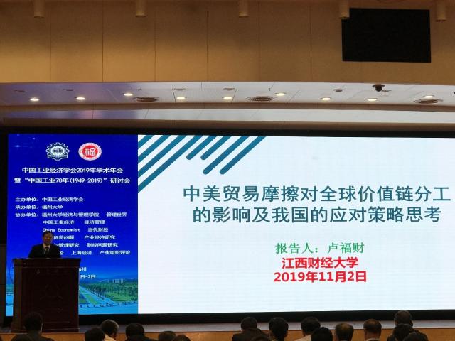 2019年11月(1-2)日,中国工业经济学会2019年学术年会暨“中国工业70年(1949-2019)”研讨会在福州隆重举行,本次会议由中国工业经济学会主办,福州大学承办,管理世界、中国工业经济、经济管理China Economist、当代财经、国际贸易问题、产业经济研究等十余家杂志社协办。350多位国内高校专家、学者及研究生参加了本次学术年会,我中心智库首席专家卢福财校长、徐斌教授、陈洪章博士参加了此次中国工业经济学术年会,本次年会主要包括四场大会主题报告,四个学术交流分论坛。应主办方邀请,卢福财校长在大会上做了《中美贸易摩擦对全球价值分工的影响及我国的应对策略思考》的主题报告,阐述了融入了全球价值分工体系是我国改革开放取得巨大成就的关键原因,在当前中美贸易摩擦背景下,关注了此次贸易摩擦对全球价值链分工的影响。