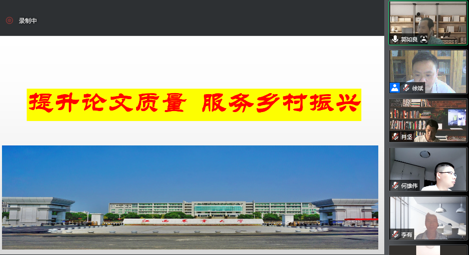 本次沙龙特邀江西农业大学期刊社社长、常务副主编郭如良、江西财经大学当代财经杂志社副社长、副主编李有、江西师范大学杂志社副社长、副主编罗序斌、《价格月刊》副主编肖坚、《企业经济》副主编何雄伟进行主题演讲,几位主编围绕乡村振兴、产业发展、数字教育、商品价格、企业经济等探讨“把论文写在祖国大地上”,分享论文写作与投稿经验,并与师生们展开深入交流。